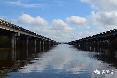 在靠近尽头的路易斯安那州,会经过一段上百英里的高架桥。这些高架桥修在法国人在18世纪开凿的运河上,周围包裹着沼泽密林。有时,你能看见鳄鱼在桥下水面游过。在走完这一段奇特的水上公路后,就能到达爵士乐的故乡——新奥尔良。